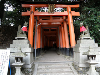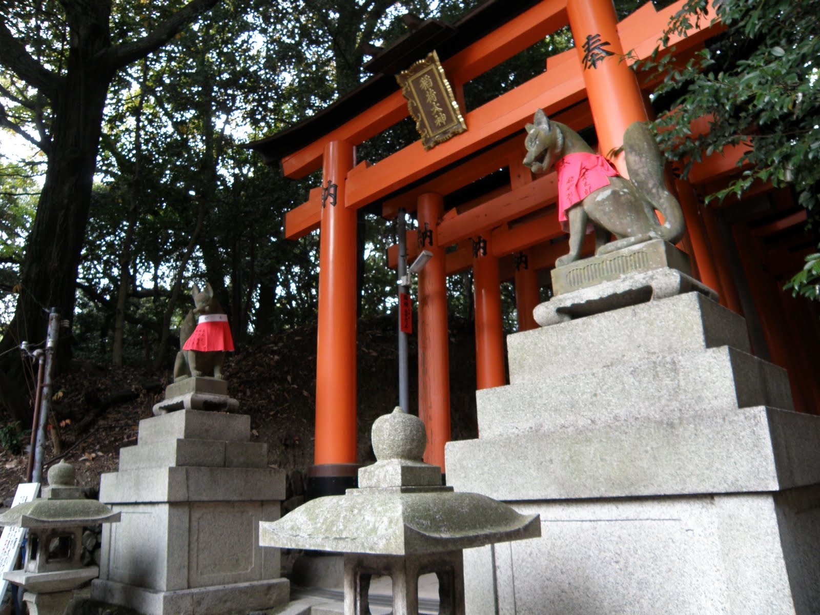 Inari Taisha, the head shrine of a Shitoism sect, there are deities who preside over productiveness of grain and business. They use foxes as messengers. So you can see the pair of stone guardian foxes at the gate of the shrine.
